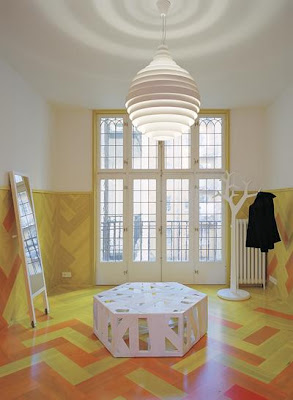 Je ne ferais pas ca chez moi, mais je trouve l'idée assez amusante. Et vous avez remarqué sur la dernière photo la lampe fabriqué à partir d'objets IKEA bon marché et la table en forme de carte de la Suède?