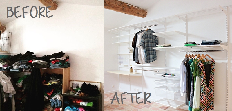 Avec Delphine et Johann de chez Elfa, on allait transformer le chaos de la chambre d'Emilie en ordre avec de nouveaux rangements fonctionnels et élégants. Comme vous pouvez le constater sur les photos avant/après ci-dessous, la transformation est assez spectaculaire!