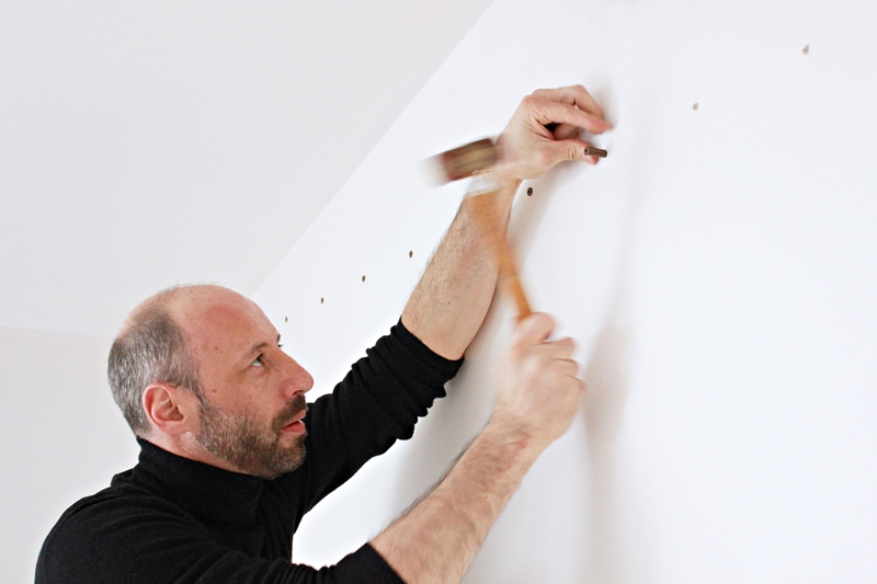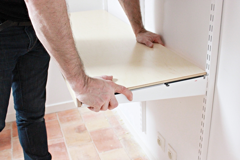 Le système d'étagères d'Elfa est super facile à installer. Johann a commencé par fixer la lisse de suspension au mur. Cette lisse est en fait le seul élément pour lequel vous avez besoin de percer le mur.