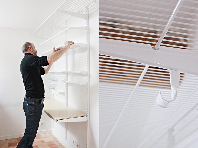 Elfa's shelving units are super easy to install. Johann started by fixing the top track on the wall. This track is actually the only part for which you need to drill holes in the wall.