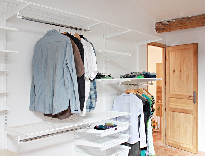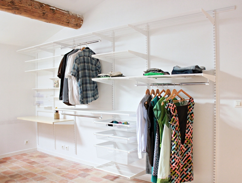 Puis on emboite les consoles et ajoute étagères, tubes penderie, patères, porte-chaussures, paniers et autres accessoires. Le système est extrêmement flexible et facile à modifier au fil du temps si besoin.
